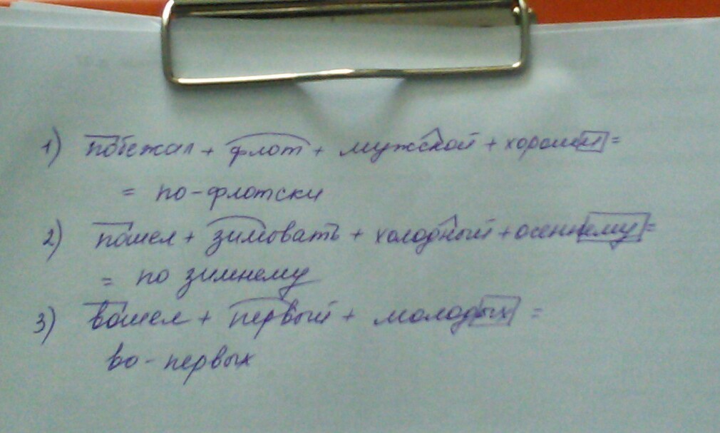 Запишите получившиеся слова и произведите их морфемный разбор.1)Возьмите приставку в слове《 побежал》,корень в слове 《флот》,суффикс в слове 《мужской》,окончание в слове 《хороши》.2)возьмите приставку в слове 《пошел》,корень в слове 《зимовать》,суффикс в слове《холодный》,окончание в слове《осеннему》.3)возьмите приставку в слове 《вошел》,корень в слове 《первый》,окончание в слове《молодых》.