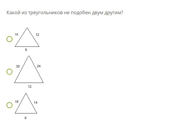не подобен последний. у подобных треугольников отношение подобных сторон равно, то есть если брать первый и второй треугольник
