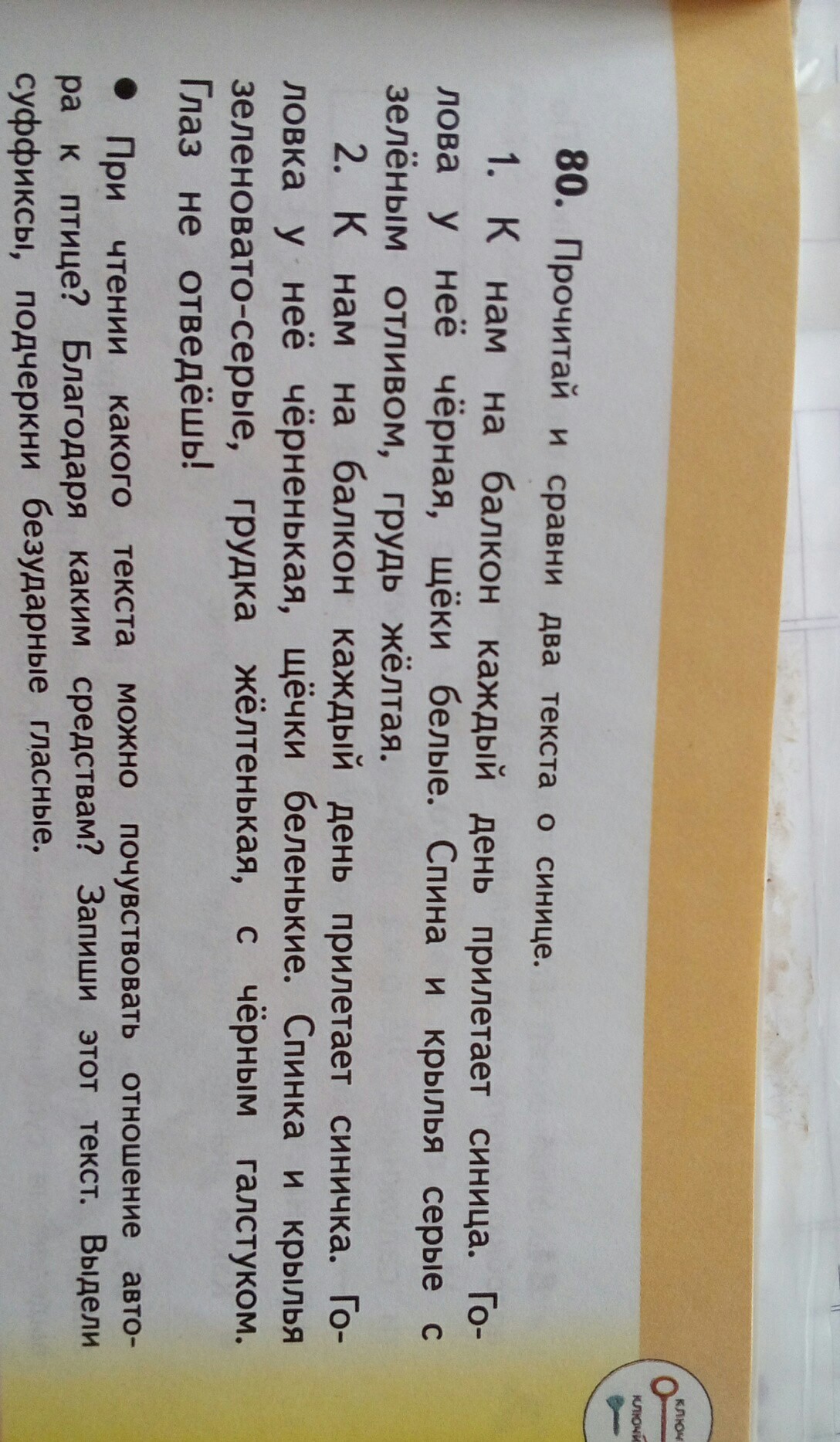 Отношение автора текста к синице есть во втором тексте. Его можно почувствовать благодаря тому, что во многих словах есть уменьшительно-ласкательные суффиксы и по последнему восклицательному предложению.