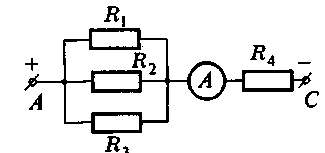 Используя схему электрической цепи, изображенную на рисунке, определите общее напряжение на участке АС, если амперметр показывает 5А, а R1 = 2 Ом; R2 = 3 Ом; R3 = 6 Ом; R4 = 5 Ом.