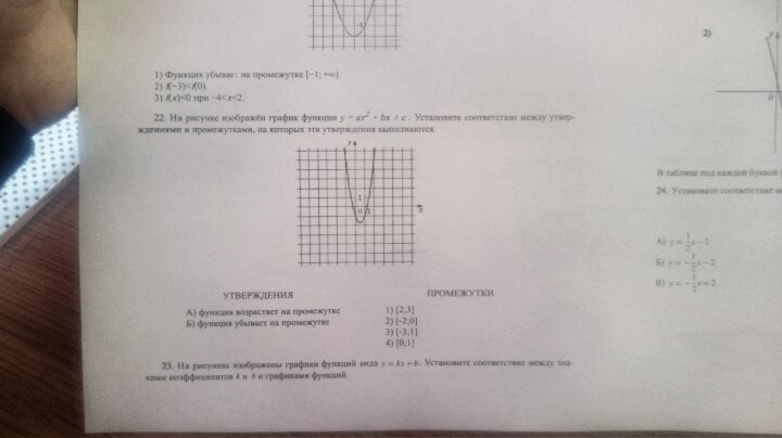 на рисунке изображен график функции y=ax^2+bx+c установите соответствие между утверждениями и промежутками, на которых эти утверждения выполняются