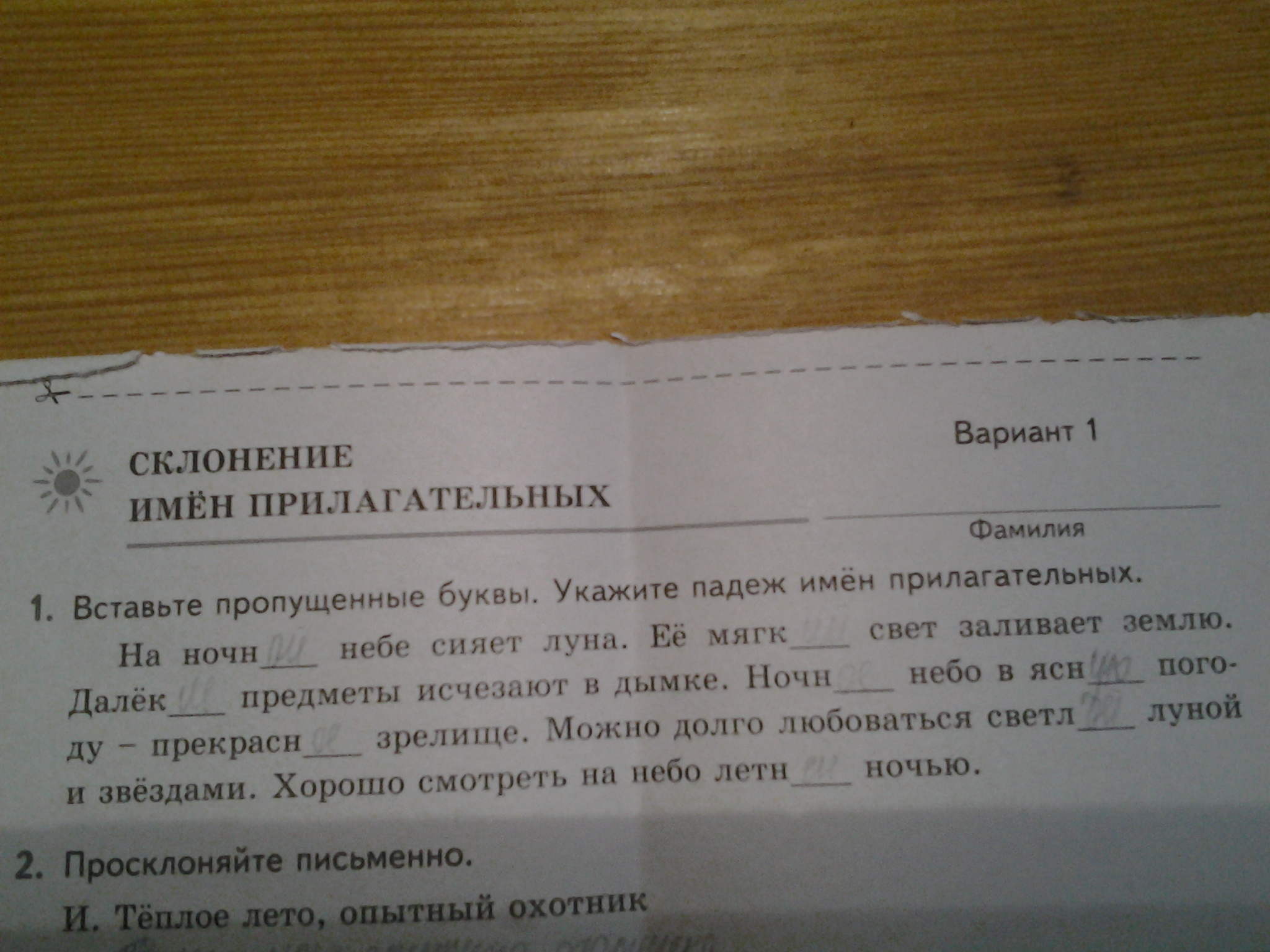 На ночном(П.п) небе сияет луна. Ее мягкий(И.п.) свет заливает землю.Далекие(И.п.)предметы исчезают в дымке. Ночное(И.п) небо в ясную(В.п.)погоду-прекрасное(И.п)зрелище. Можно долго любоваться светлой(Т.п) луной и звездами. Хорошо смотреть на небо летней(Т.п) ночью
