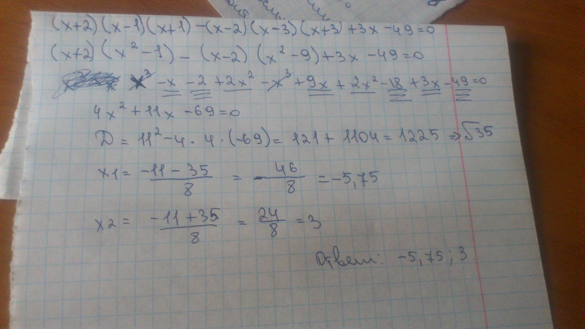 (х+2)(х-1)(х+1)-(х-2)(х-3)(х+3)+3х-49=0