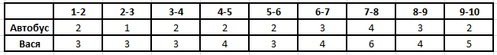 Известно, что в настоящий момент автобус отправляется с остановки №1, также известно, что на каждой остановке автобус находится ровно 1 минуту и известно, сколько ехать автобусу между остановками, а сколько идти Васе (см. таблицу).
