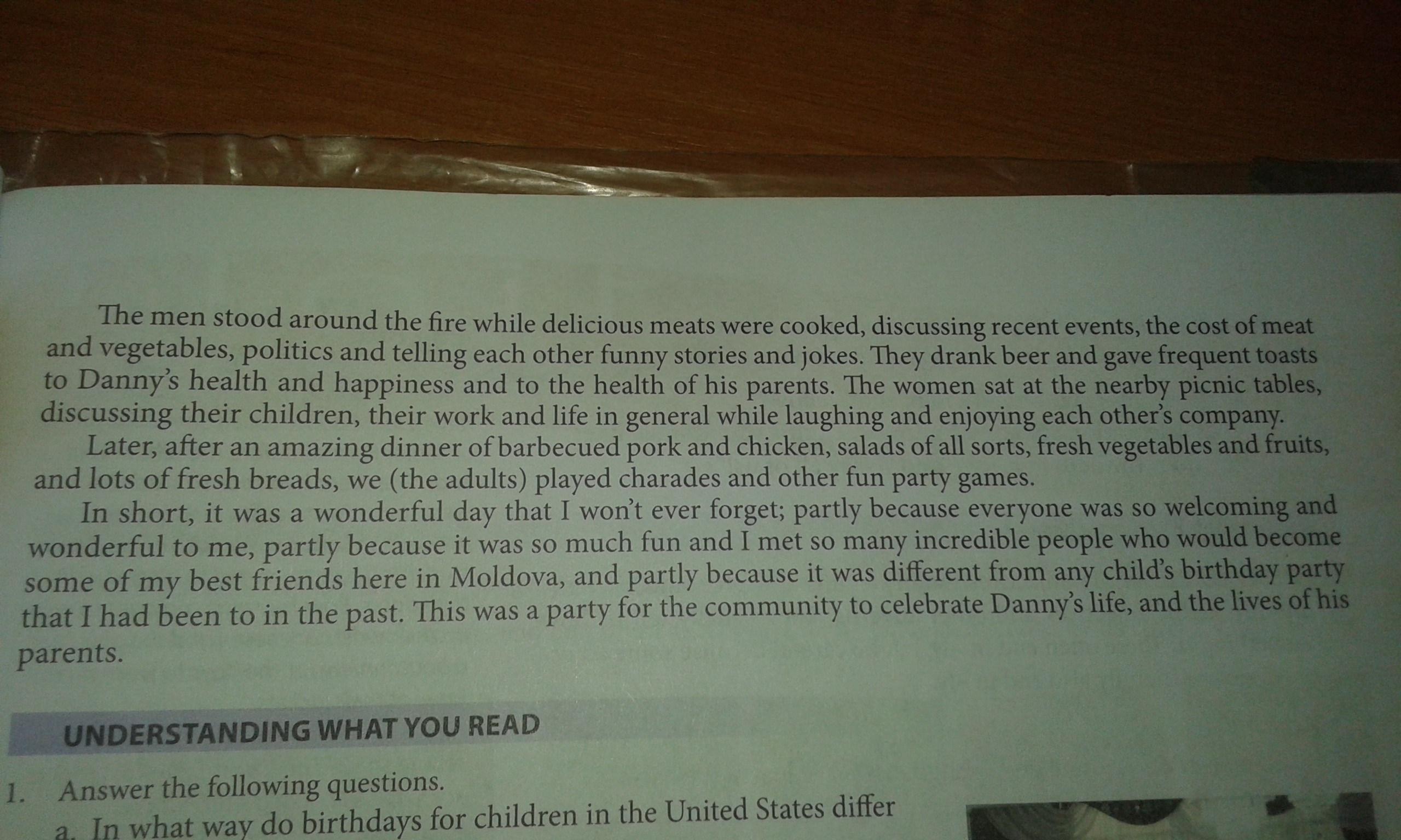 Но в Молдове, это было совсем по-другому. Мне сказали, что мне не надо было ничего приносить мальчику. Конечно, я перенёс кое что. Ноя был единственный.(Позже я узнал, что другие взрослые подарили Дани подарки прямо у него дома.)Что было самым удивительным, то что этот день был больше праздником для Даниных родителей, которые купили всю еду и запасы для барбекю на открытом воздухе. Конечно, там был Даня и там был клоун который исполнял фокусы для детей, которые также были там. Но после двух часов, все дети были уведены в их дома, а Даня к бабушке и дедушке.