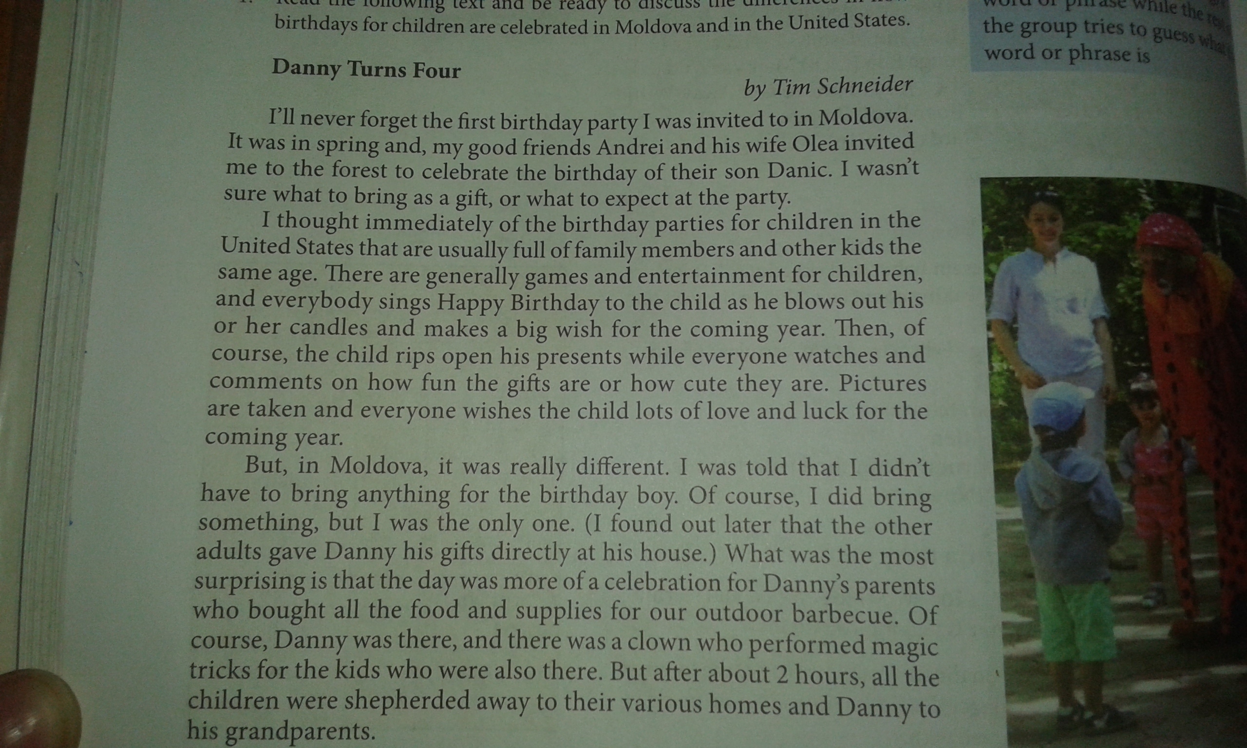 Я никогда не забуду первую вечеринку, на которую меня пригласили в Молдове. Была весна и мои хорошие друзья, Андрей и его жена Оля пригласили меня в лес отпраздновать день рождения их сына Дани. Я не был уверен что принести в качестве подарка или что ожидать на вечеринке. Я сразу подумал об вечеринках для детей в Соединённых штатах, которые обычно полны родственников и других детей одинакового возраста.