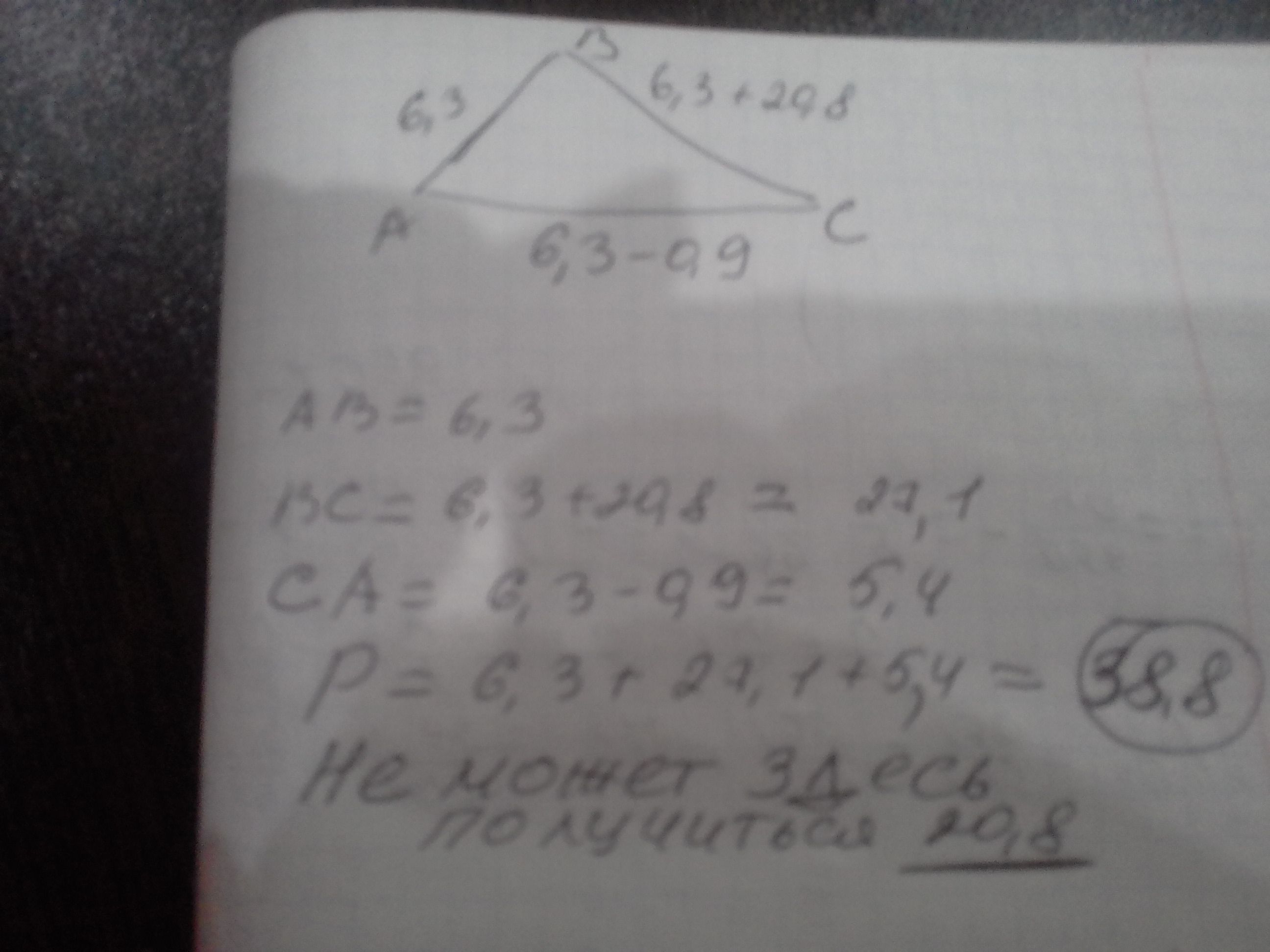 Сторона треугольника,равна 6,3 см, на 20,8 см меньше второй стороны и на 0,9 см больше третьей стороны. Найдите периметр треугольника. Заранее спасибо:)