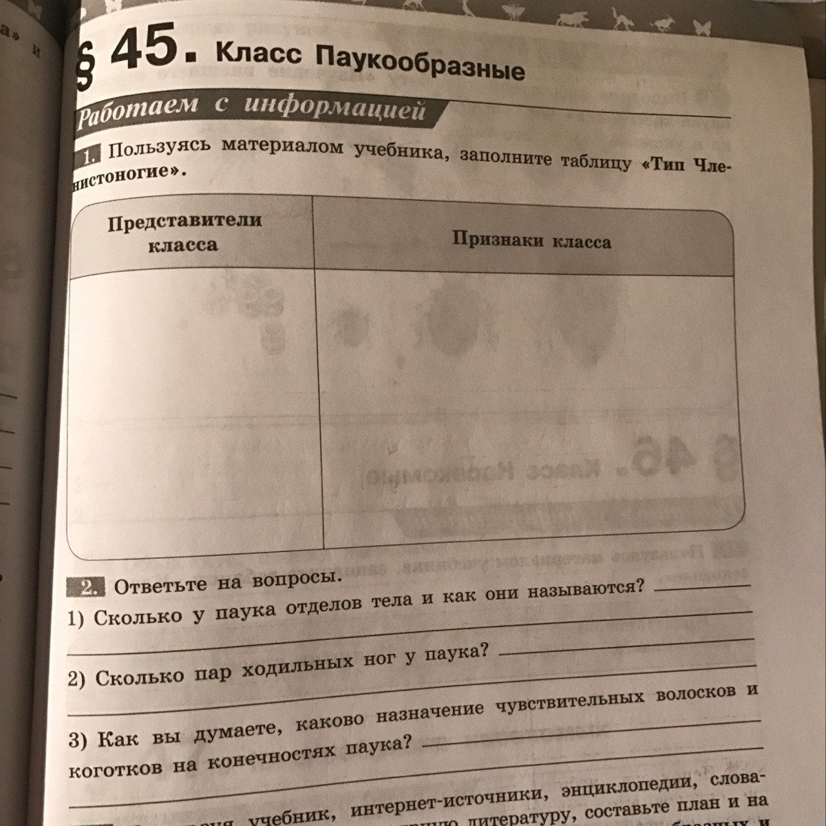 1.Пользуясь материалом учебника, заполните таблицу "Тип членистоногие"