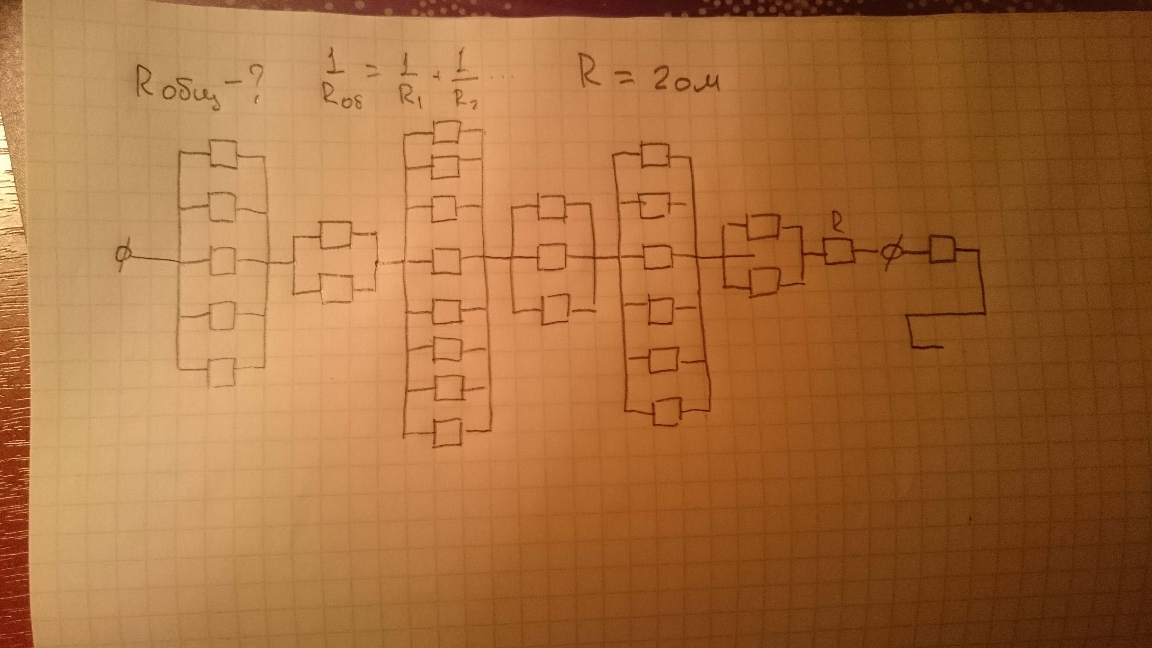 Можно выделить 6 участков, которые соединены параллельно и пользуясь законами параллельного соединения проводников рассчитать сопротивление каждого участка.Все 6-ть участков соединены между собой последовательно с 7-м участком, и тогда общее сопротивление всей цепи будет равно сумме сопротивлений всех участков: