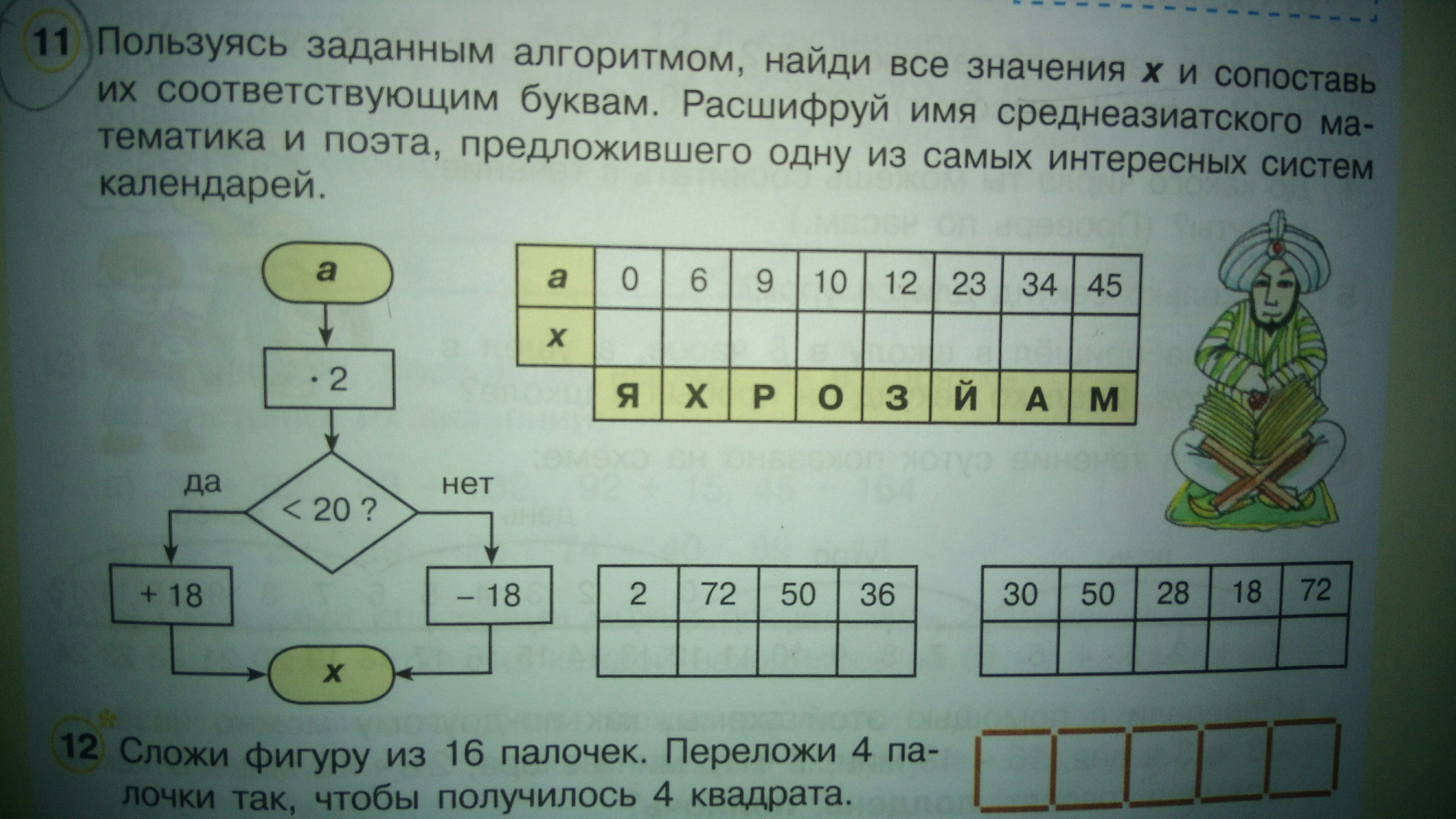 пользуясь заданным алгоритмом, найди все значения x и составь их соответствующим буквам.