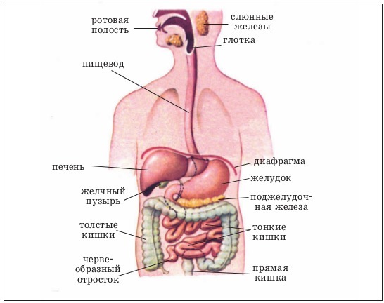 Вот картинка, на ней всё изображено. Если нужно более подробное описание, например, с более подробным описанием того, как делится на отделы кишечник или какие есть отделы у желудка - то пишите, с радостью помогу.