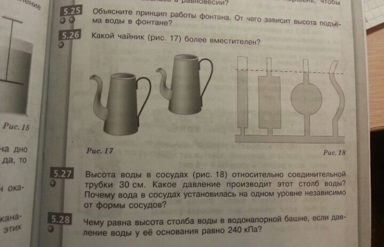 5.26 Воды больше поместится в чайник с высоким горлышком. Когда уровень горлышка сравняется с уровнем воды в чайнике вода начнет вытекать.
