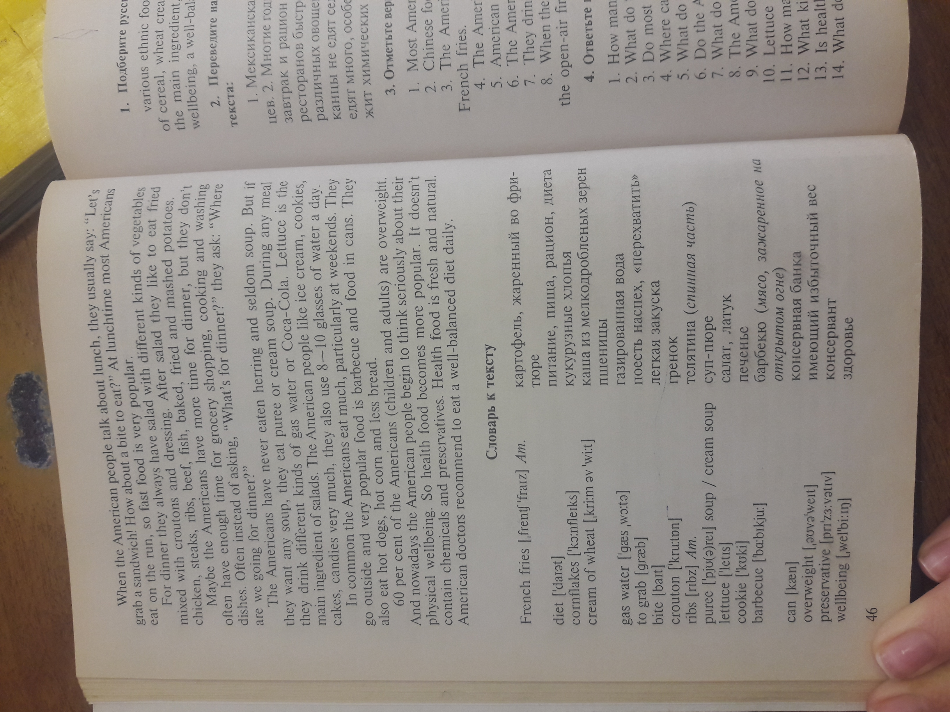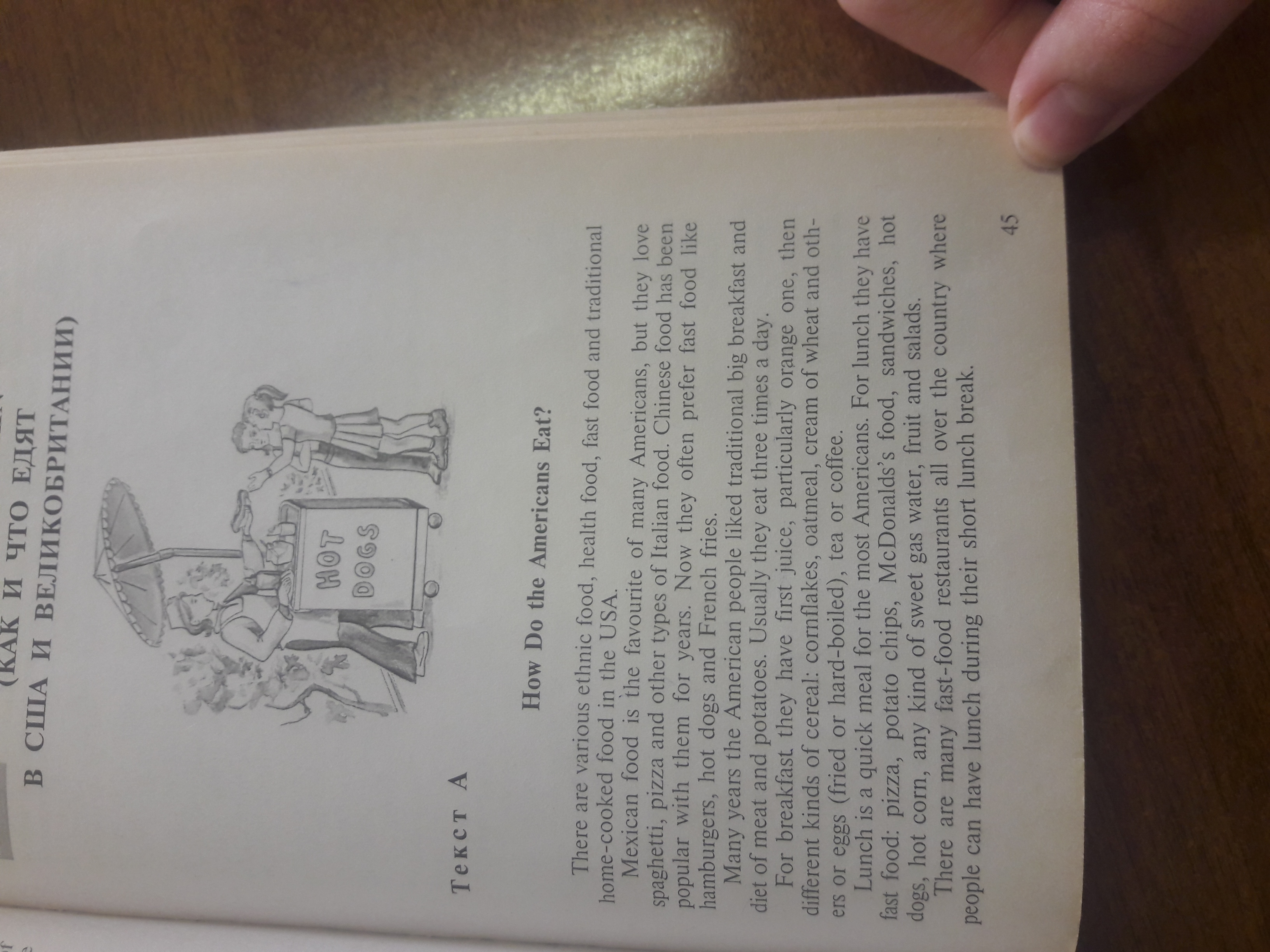 Как американцы едят? Есть различных этнических питания, здорового питания, фаст-фуд и традиционные дома приготовленную пищу в США мексиканского продовольствия является фаворитом многих американцев, но они любят я, пиццу и другие виды итальянская кухня, китайская еда была opular с ними годами, теперь они часто предпочитают фаст-фуд, как mburgers, хот-доги и французский картофель много лет, американский народ любил traduonal большой завтрак и диеты мясо и картофель М как правило, они едят три раза день. На завтрак они имеют первый сок, особенно оранжевый один. затем различные виды зерновых comiakes, овсянка, крем пшеницы и други ers или яиц (жареные или вкрутую). чай или comee обед является быстрой еды для большинства американцев для обеда, они имеют пицца быстрого питания, картофельные чипсы, McDonalds еда бутерброды. горячая собака горячей кукурузы. любого рода сладкий газ вода, frunt и салаты там находятся многие последний-ресторанов по всей стране, где pe le может иметь обед во время их короткого обеденного перерыва