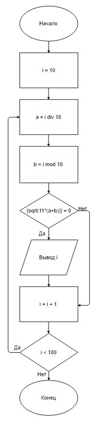 Составьте алгоритм нахождения таких двузначных чисел, которые в сумме с числом, записанным теми же цифрами, но в обратном порядке, дают квадрат натурального числа. Например числа 38 и 83. Блок схема с постусловием пожалуйста