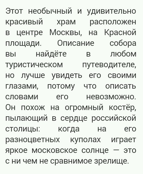 This unusual and surprisingly beautiful temple is located in the center of Moscow, on Red Square. Description of the cathedral you will find in any tourist guide but better to see it with my own eyes, because it is impossible to describe in words It is similar to a huge fire burning in the heart of the Russian capital when its multicolored domes of Moscow plays bright sun with atoms or the incomparable spectacle.