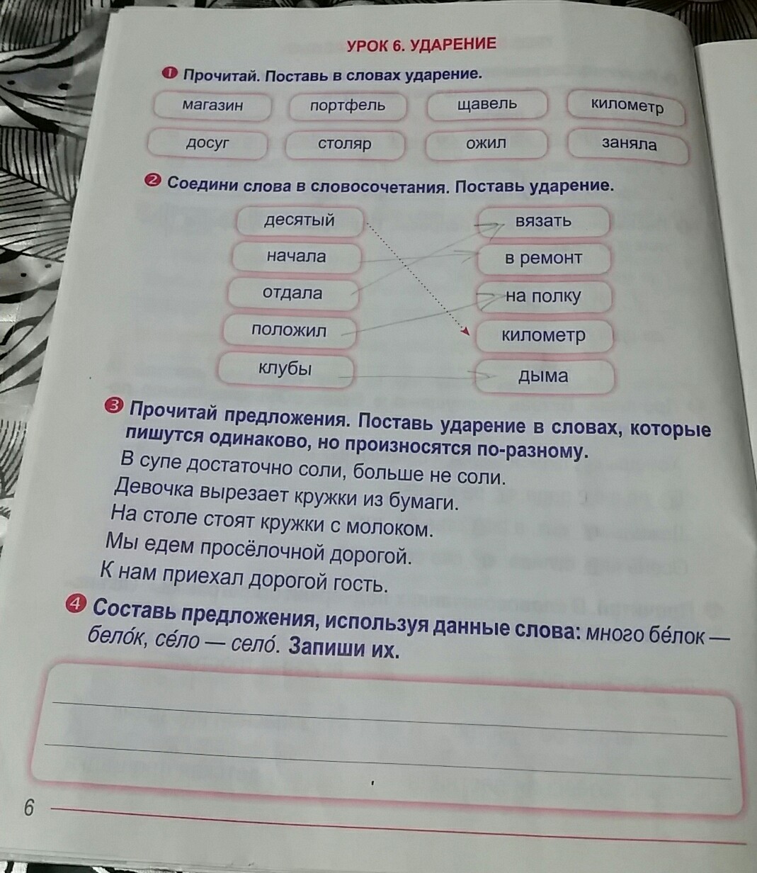 3. в супе достаточно сОли, больше не солИ; девочка вырезает кружкИ из бумаги; на столе стоят крУжки с молоком; мы едем просёлочной дорОгой; к нам приехал дорогОй гость.