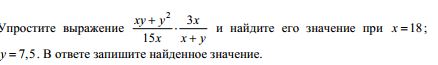 выносим общий множитель получится: y(x+y)/15x * 3x/x+y , сократим (x+y) и 3x и 15x, получится: y/5, подставим вместо у 7,5, получится 7,5/5=1,5