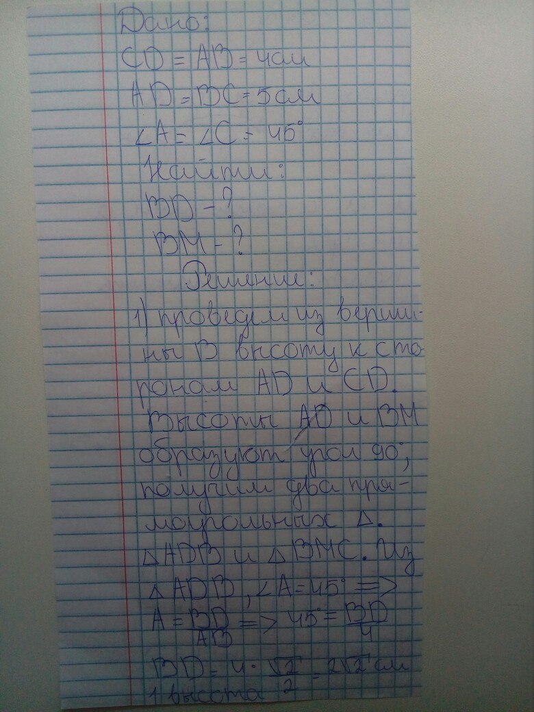 стороны параллелограмма равны 4 и 5 см угол между ними 45 градусов найдите высоты параллелограмма