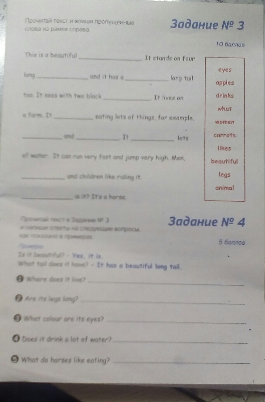 This is a beautiful animal. It stands on four long legs and has a beautiful long tail too. It sees with two black eyes. It lives on a farm. It likes eating lots of things, for example, apples and carrots. It drinks lots of water. It can run very fast and jump very high. Men, women and children like riding it. What is it? It`s a horse.