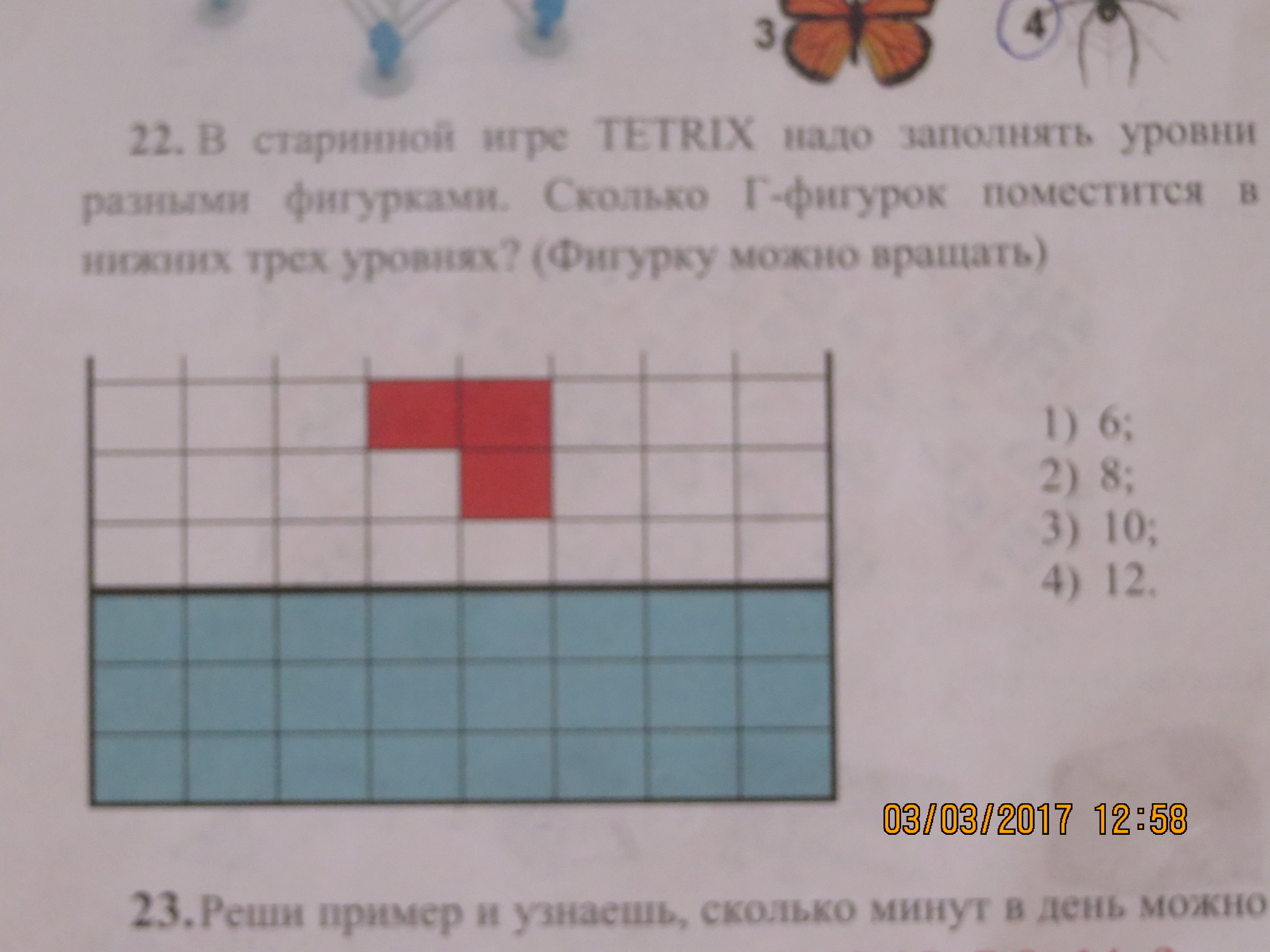 в старинной игре TETRIX надо заполнять уровни разными фигурами.Сколько Г-фигурок поместится в нижних трех уровнях?Фугуру можно вращать.