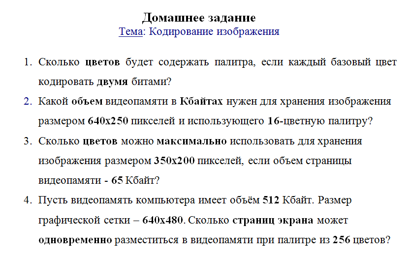 4. 256 цветов = 8бит/пикс = 1 байт/пикс. 640х480=307200 пикс, 512 кб=524288 байт,