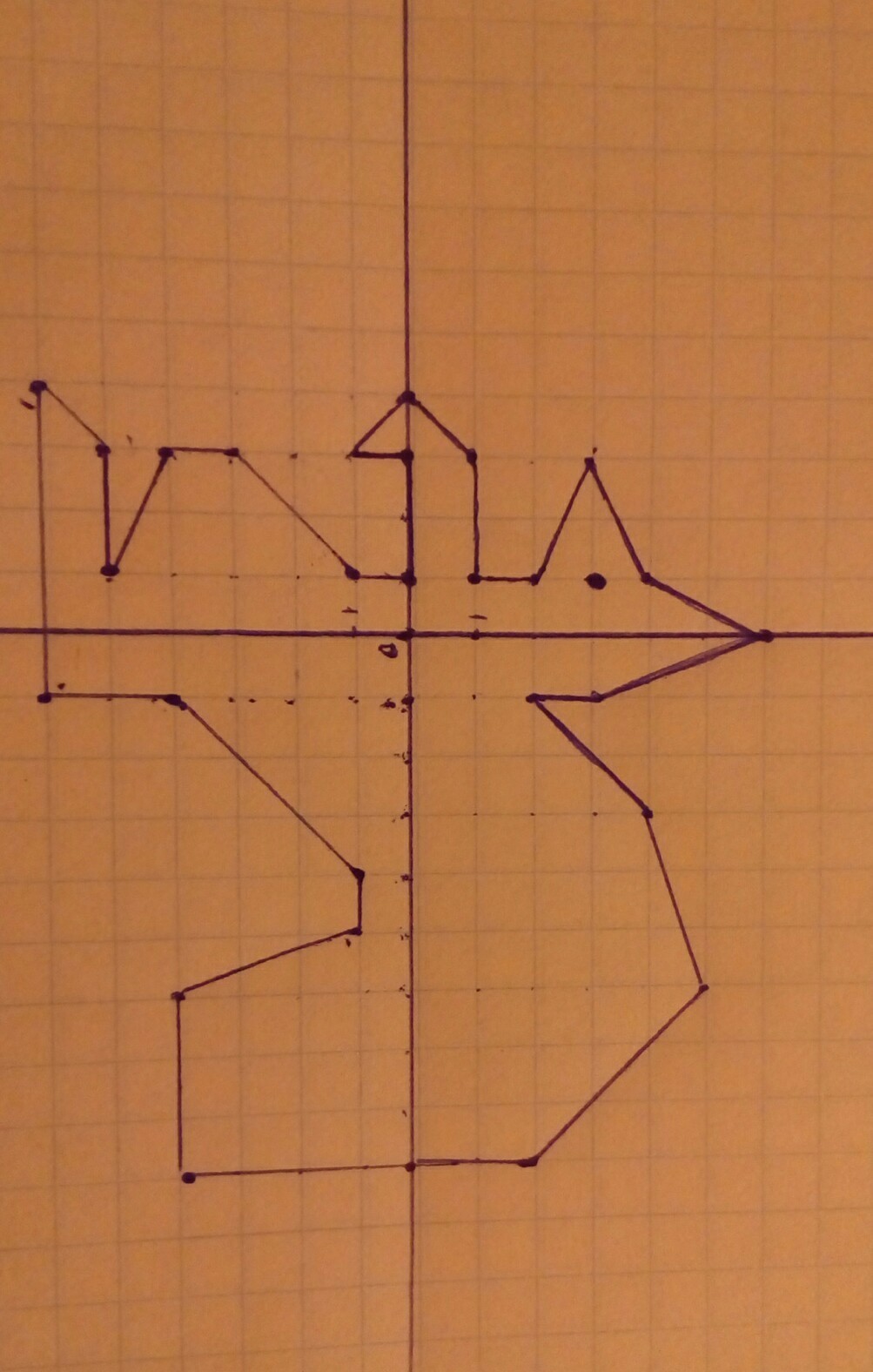 (1:-4) (1:-6) (-4:-6) (-3:-5) (-1:-5) (-3:-4) (-3:-3) (-1:-1) (-1:0) (-3:0) (-3:-1) (-4:0) (-3:1) (-1:1) (-1:2) (-3:3) (-1:4) (0:6) (1:3) (1:2) (3:4) (6:5) (9:2) (9:0) (9:-4) (6:-4) (5:-1) (4:-1) (1:-4) и глаз животного (-1:3)