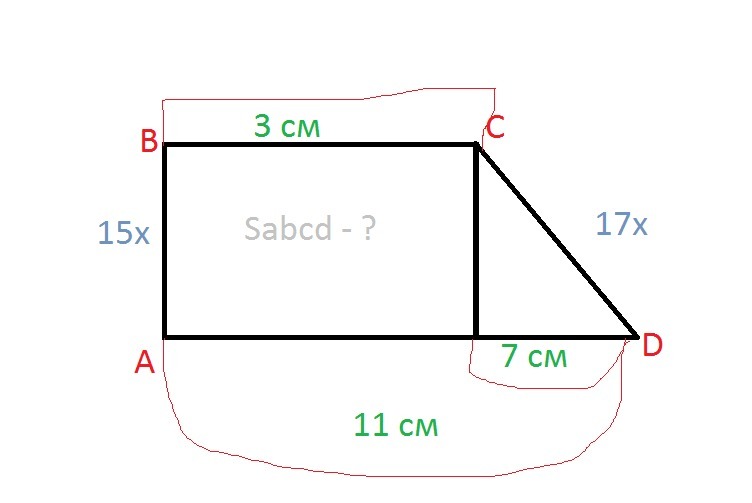 ПОМОГИТЕ СРОЧНО.Дана прямоугольная трапеция ABCD с основаниями BC и AD.AD = 11 см. BC = 3см.Соотношение сторон AB:CD=15:17.Найдите Sabcd.