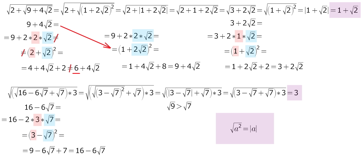 например: (√2 + √3)² = 2 + 2*√2*√3 + 3 = 5 + 2√6