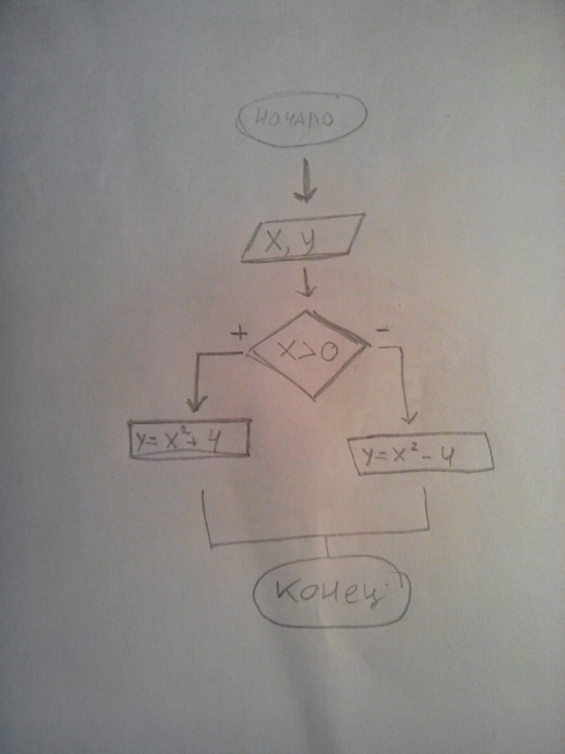 Начертить блок-схему алгоритма вычисляющего значение в зависимости от значения x, если x>0,y-x^2+4, если x<0,y=x^2-4