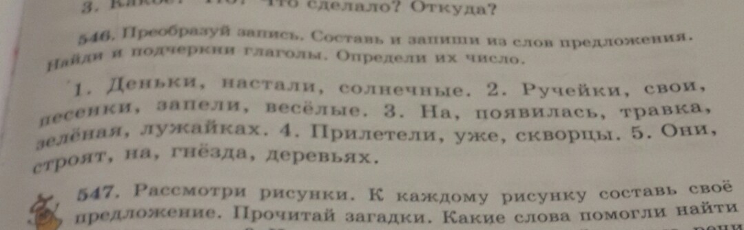 преобразуй запись Составь и запиши из слов предложения Найди и подчеркни глаголы Определи их число