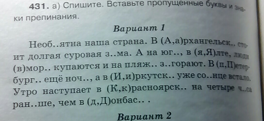 Необъятна наша страна. В Архангельске стоит долгая суровая зима. А на юге, в Ялте, люди в море купаются и на пляже загорают. В Петербурге ещё ночь, а в Иркутске ещё солнце встало.Утро наступает в Красноярске на четыре часа раньше, чем в Донбассе.