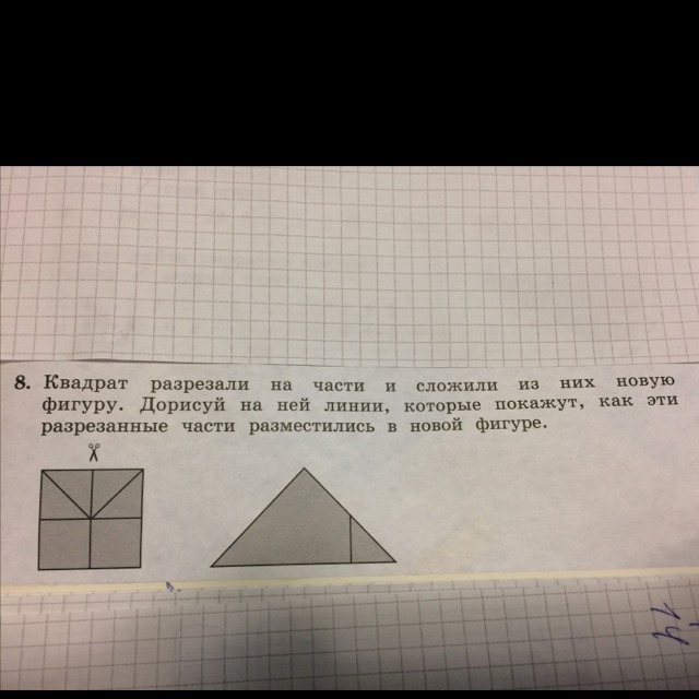 От квадрата оставили прямоугольник, один большой треугольник возвели на крышу, а оставшиеся маленькие по бокам