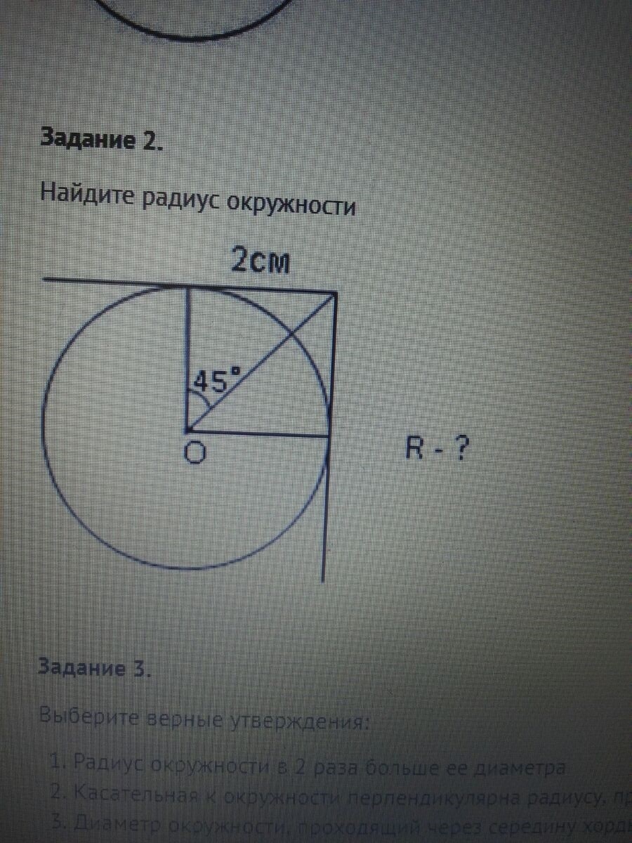 Там образуется прямоугольный треугольник. Один угол 45° , а другой 90-45=45°. Получается равнобедренный треугольник. Значит и радиус равен 2 см.