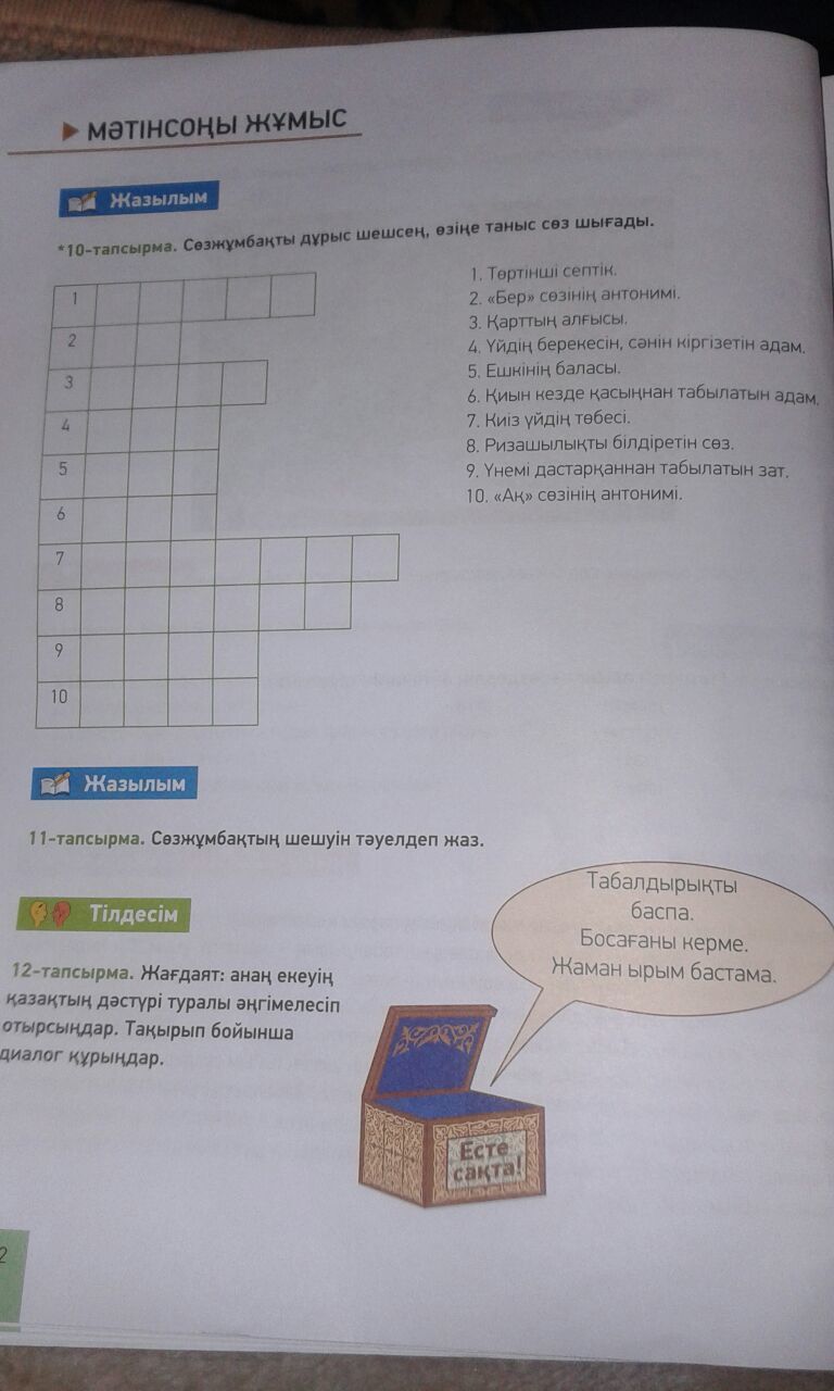 Получается слово табалдшрық, но такого слова нет в казахском языке, должно быть табалдырық, значит в седьмом вопросе есть ошибка: либо ячейки расположены ошибочно, либо вопрос дано неверно. Но есть другой термин про юрты (киіз үй):