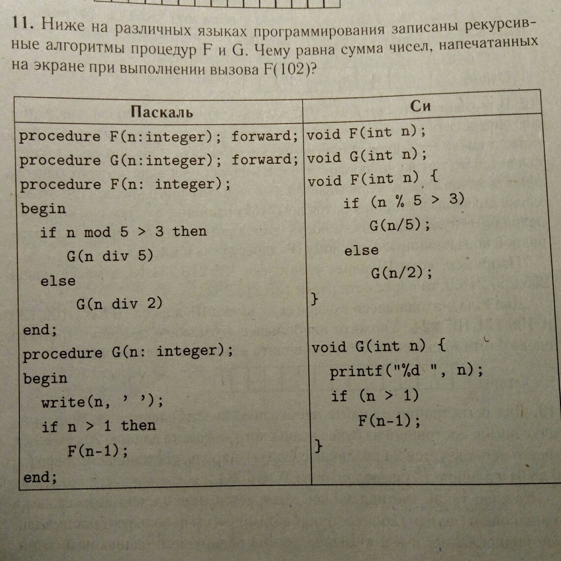 Ниже на различных языках программирования записаны рекурсивные алгоритмы процедур F и G. Чему равна сумма чисел, напечатанных на экране при выполнении вызова F(102)?