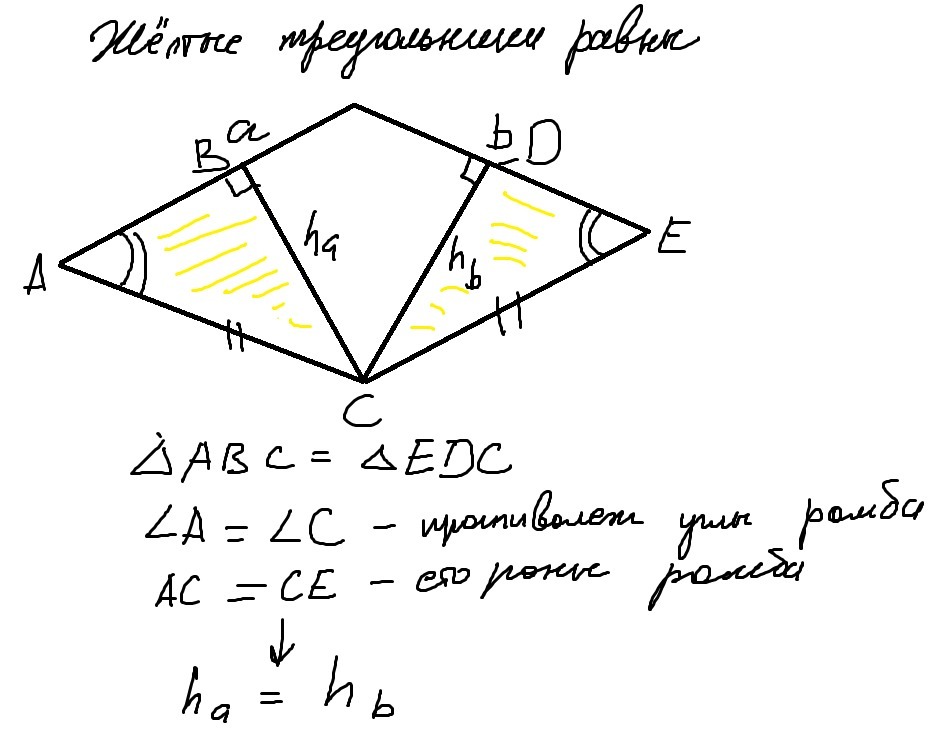 В ромбе ABDC к стороне a проведена высота h, а к стороне b проведена высота hb. Сравните длины высот ha и hb