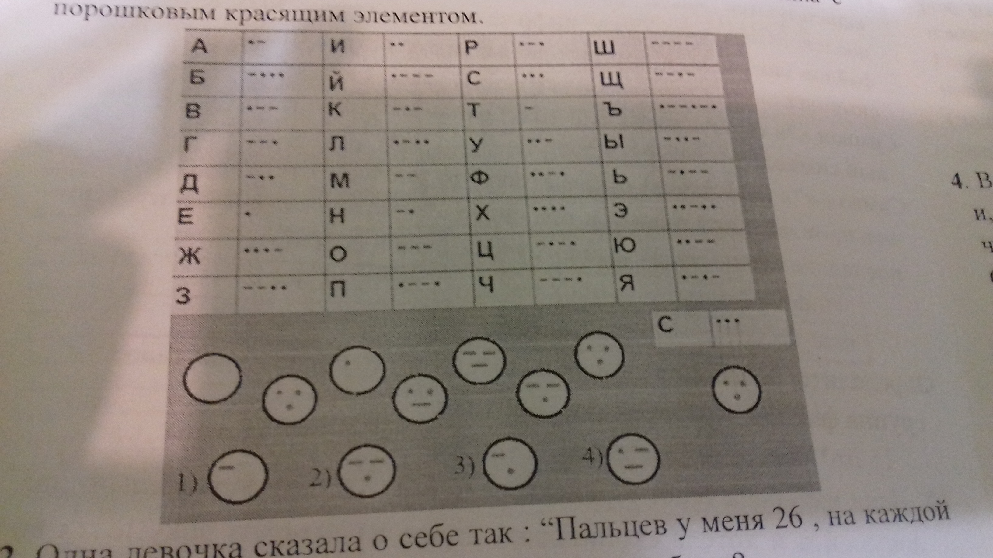 С помощью азбуки Морзе можно закодировать "смайлики". Читать смайлики нужно в определённой последовательности. Определи, каким должен быть первый смайлик, если известно, что закодирован копировальный аппарат электрографического типа с порошковым красящим элементом