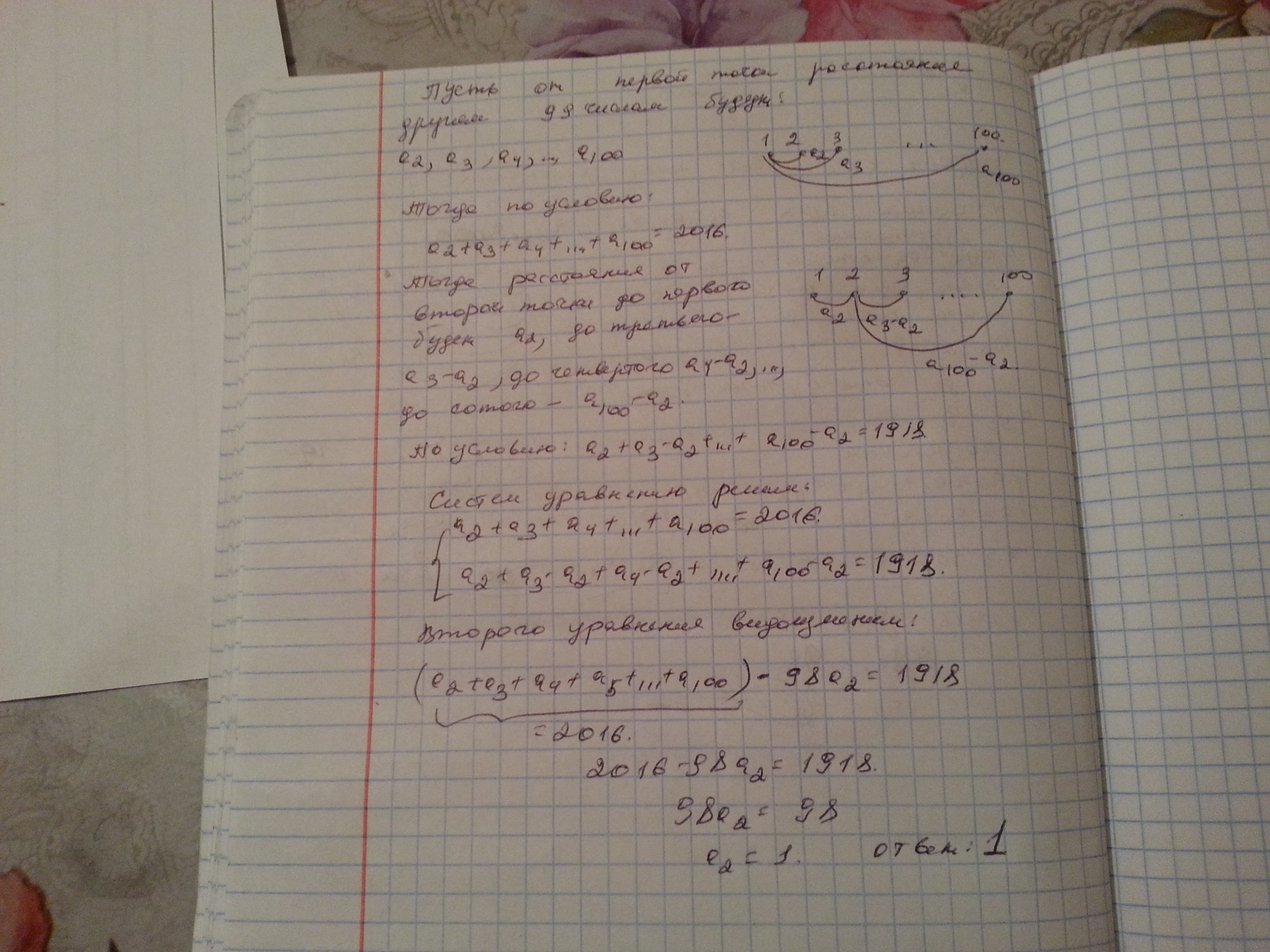 На прямой расположены 100 точек. Сумма расстояний от первой слева из них до всех остальных равна 2016, а сумма расстояний от второй слева до всех остальных (включая самую левую) равна 1918. Чему равно расстояние между первой и второй точками слева?