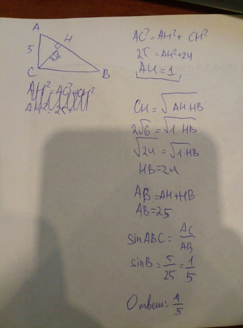 Помогите с заданием! В прямоугольном треугольнике ABC катеты AC = 5, а высота CH, опущенная на гипотенузу, равна 2 корня из 6. Найдите sin угла ABC.