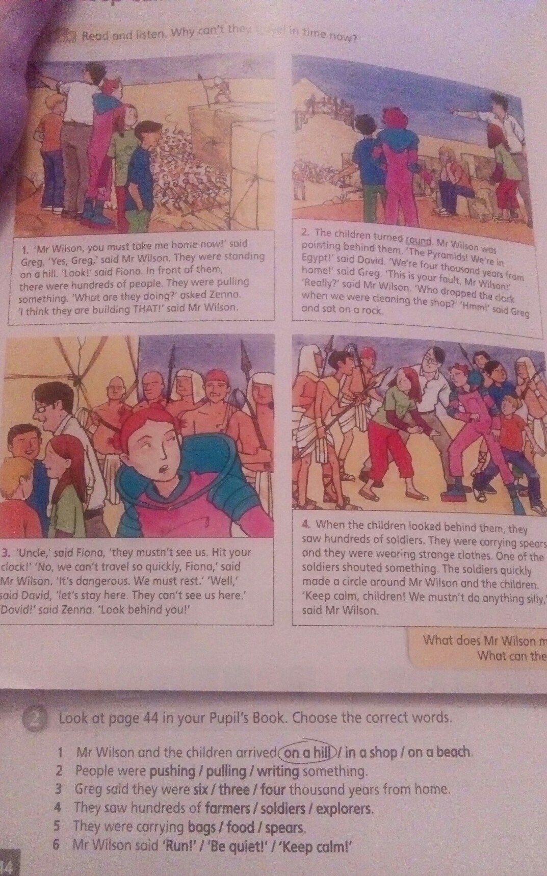 дети обернулись вокруг себя и увидели как Мистер Вилсон на что-то показывает пальцем. пирамиды. мы в Египте, дети . мы находимся в 4 000 году до нашей эры . Это неправда Мистер Вилсон . да? кто переводил часы когда мы были в магазине сказал Грег сеа на камень