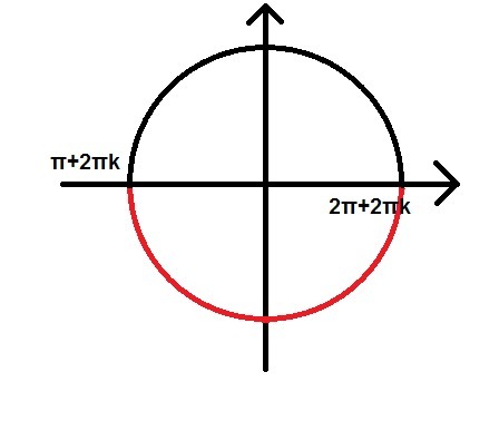 sin x ≤ 0 - Значит на вертикальной оси нас интересует область лежащая не выше y=0. Смотрим, в точках с какой мерой угла у нас пересекается окружность с прямой y = 0. Получим π+2πk и 2π+2πk, k целое.