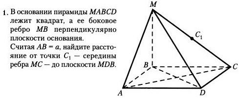 В основании пирамиды MABCD лежит квадрат, а её боковое ребро MB перпендикулярно плоскости основания. Считая AB=a, найдите расстояние от точки C1- середины ребра MC - до плоскости MDB. Смотреть прикрепленный рисунок (помогите)