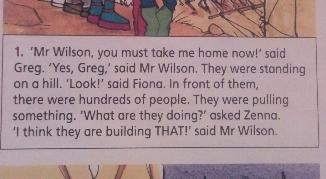 "Да, Грег,"- ответил мистер Вилсон. Они стояли на вершине холма. " Смотрите!"- сказала Фиона. Перед ними было сотни людей. Они что-то толкали. " что они делаю?"- спросила Зенна. " Я Думаю, что они строят ЭТО!"- ответил мистер Вилсон