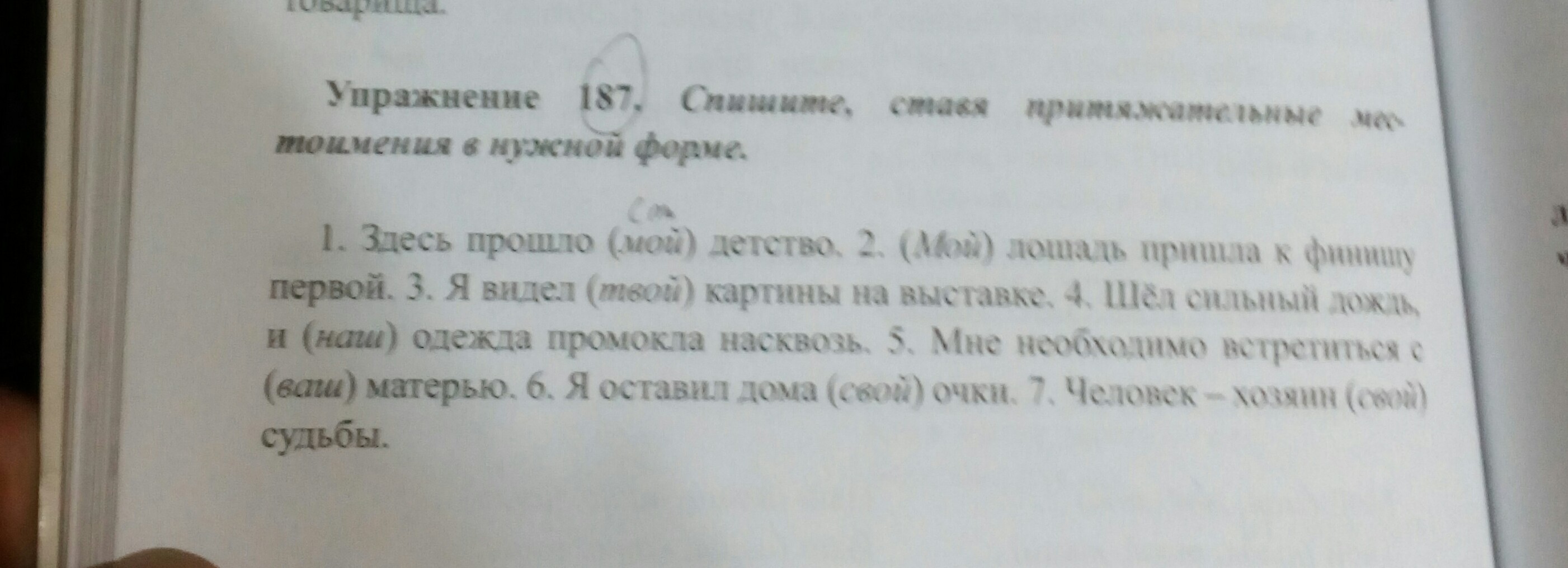 1 Здесь прошло моё детство.2 Моя лошадь пришла к финишу первой.3 Я видел твои картине на выставке.4 Шел сильный дождь,и наша одежда промокла насквозь.5.Мне необходимо встретиться с вашей матерью.6 Я оставил дома свои очки.Человек-хозяин своей судьбы