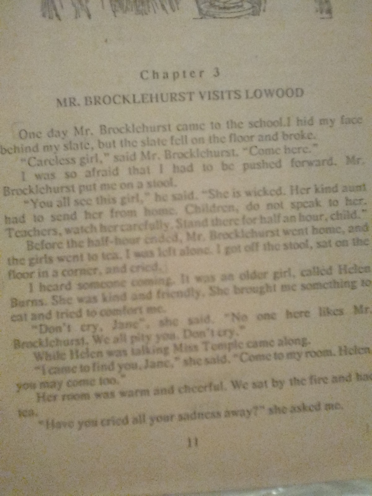 Я услышала, что кто-то идёт. Это была девочка постарше, её звали Хэлен Бёрнс. Она была добра и дружелюбна. Она принесла мне кое что поесть и попыталась успокоить меня.