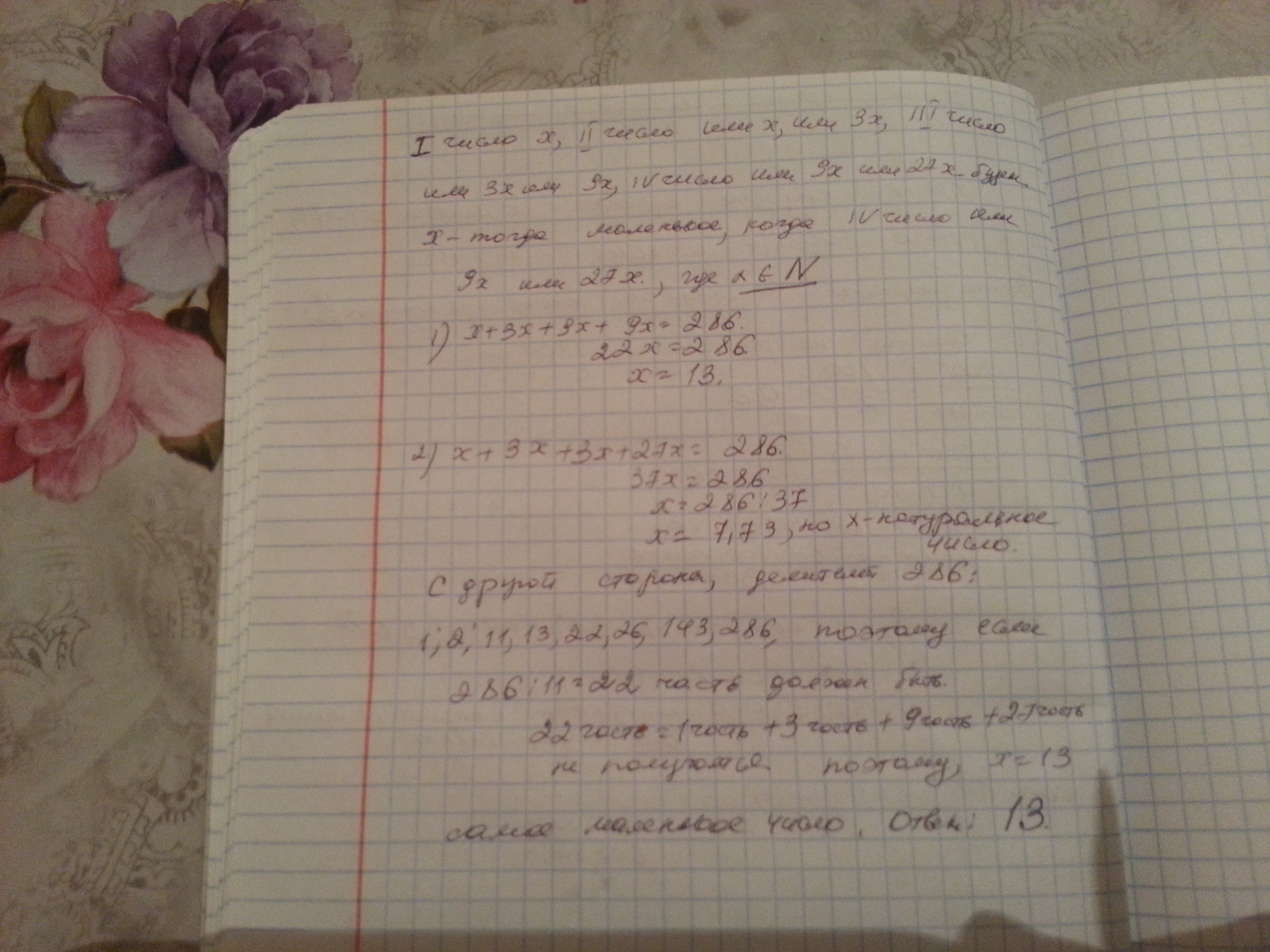 В ряд выписаны четыре натуральных числа, их сумма равна 286. Известно, что каждое число (кроме первого) либо равно предыдущему, либо втрое больше его. Чему равно самое маленькое из этих четырех чисел?