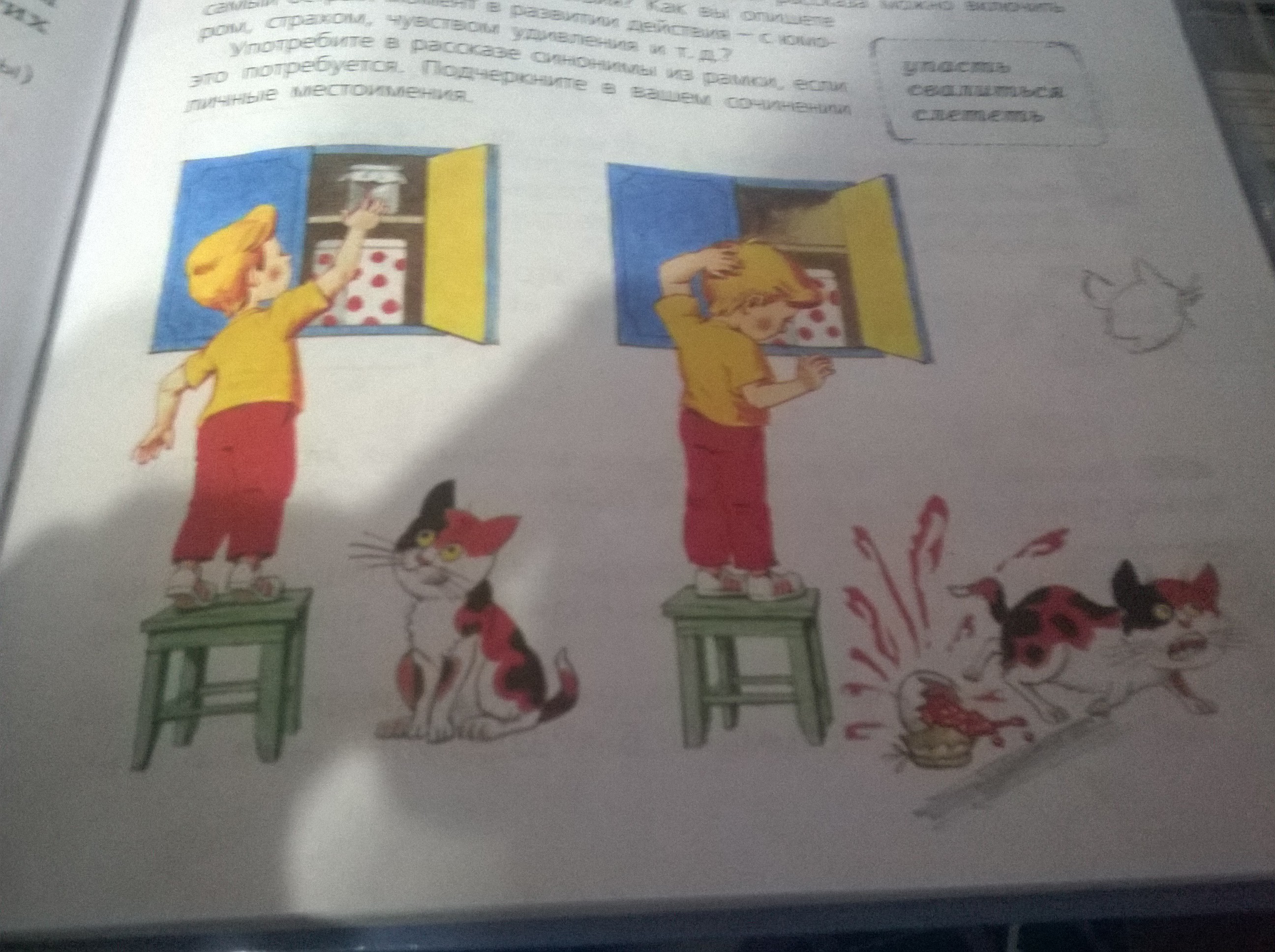 Неожиданно котик Жорка пробежал мимо моего стула. Я пошатнулся, а баночка с вареньем выпала из моих рук. Я растеряно посмотрел вокруг. Довольный Жорка слизывал лакомство со своих лапок. Мама не ругала меня, а лишь посмеялась с нашего проказника кота.