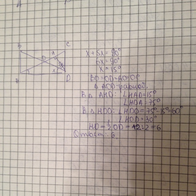 СРОЧНО! В прямоугольнике ABCD уголADB: уголCDB = 1:5 , AC=24 . Найдите расстояние от точки D до диагонали AC .