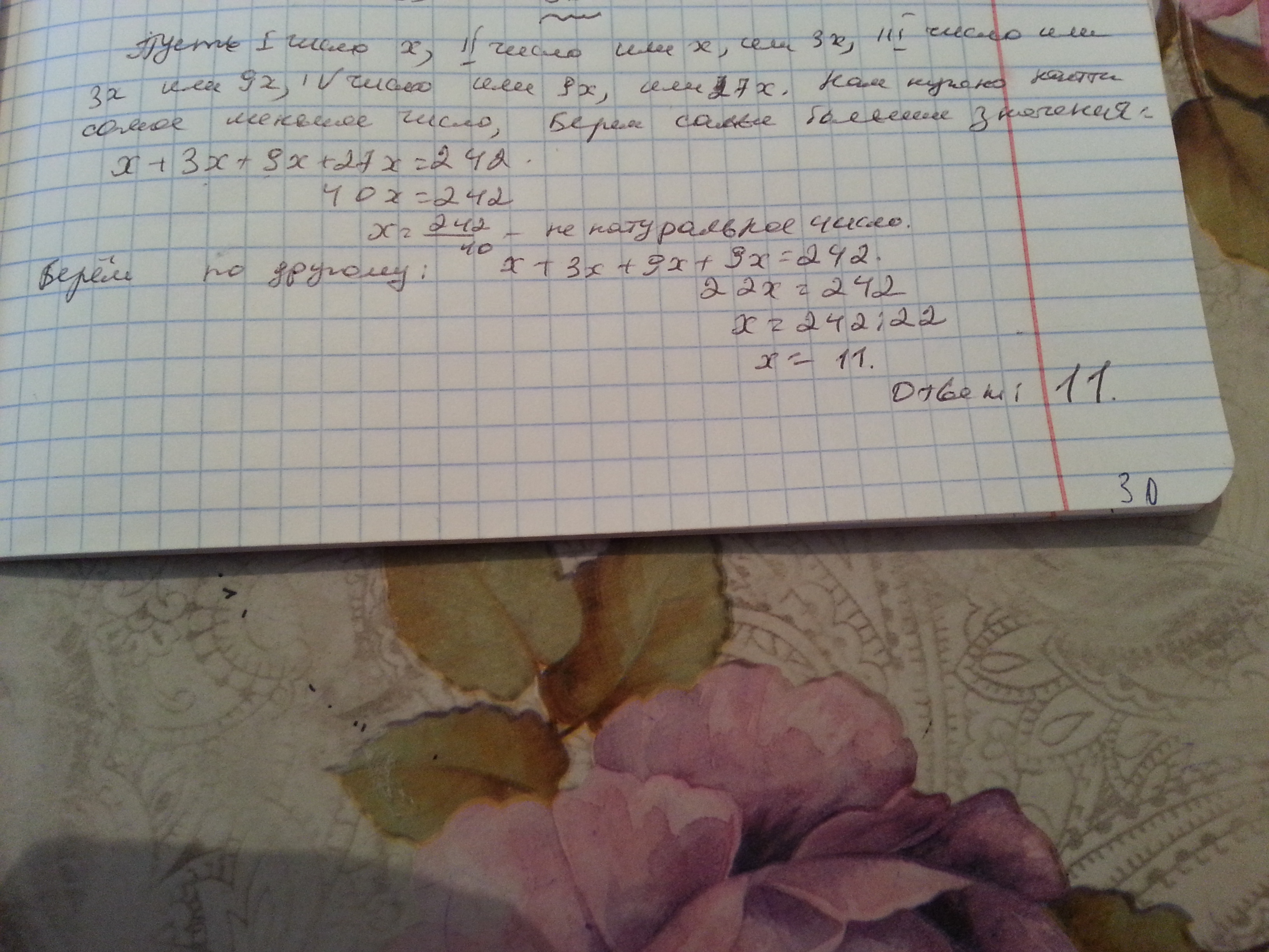 В ряд выписаны четыре натуральных числа, их сумма равна 242. Известно, что каждое число (кроме первого) либо равно предыдущему, либо втрое больше его. Чему равно самое маленькое из этих четырех чисел?