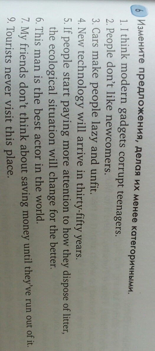 1. Я думаю, что современных гаджетов коррумпированных подростков. 2. Люди не любят новичков. 3. Автомобили делают людей ленивыми и непригодной. 4. Новая технология поступит в тридцать лет пятьдесят. 5. Если люди начинают обращать больше внимания на то, как они распоряжаются экологическая ситуация изменится к лучшему. 6. Этот человек является лучшим актером в мире. Мои друзья не думают о экономить деньги, пока они не бежать о туристы никогда не посетить это место.
